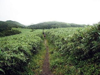 コースも終盤近く…とうとう体が言うことをきかなくなってきた頃 前の人についていけなくなってきて… 足が痛い… でもこんな画像撮ってるぐらいなら、もっとしっかり歩け!私 笹原の真ん中を歩いて行く このあたりで本当は利尻富士が綺麗に見えるんだろうな |