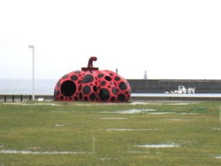 | 激しい雨で出迎えてくれた宮浦港の 大きな赤いカボチャ…もちろん草間彌生さん作 |