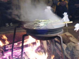 湯の花の神事ー釜の湯を汲んで家を清め、立願が叶ったお礼を申し上げる儀式