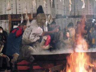 | 社の中央に作られたかまど…祭り中火が焚かれます | 八百万の神を招く儀式 | 湯を立て、湯を浄めます |