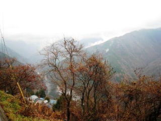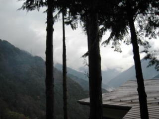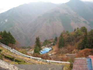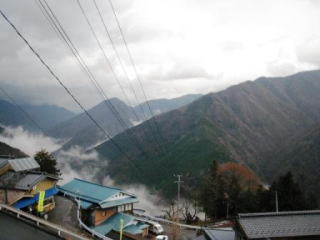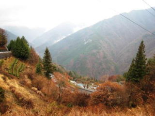 | 南アルプスの姿は残念な天候でこんな感じ | 秋も終わり…柿の木の下には深い谷 | かなり急勾配の道が山の上まで続きます |