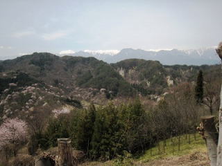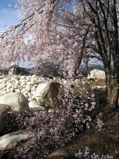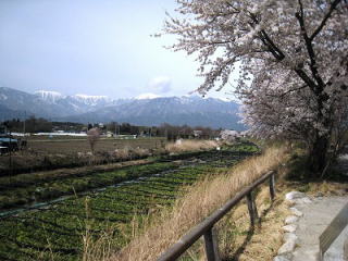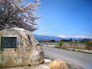「早春賦」の碑がある川原です 桜並木が山をバックに続く 春の日差しに包まれた、まさに春爛漫のひとこま 爽やかな風が吹いて このままここに ずっとたたずんでいたかった… |