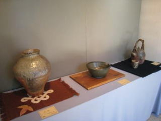 | 陶芸仲間3人の作品が並びました | 私の作品です!どうです?男性的でしょ?! |