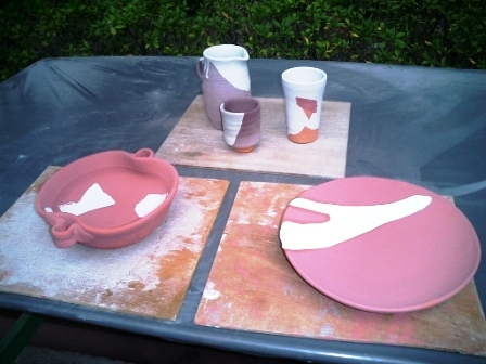 手前向かって右が平皿…赤天目に白511をひしゃく掛け(酸化予定)
