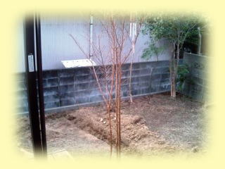 | 庭の西側です。 あのゴールデンクレストがあった場所に新しい木を植えました。 随分明るくなったなあ…と思います。 |
