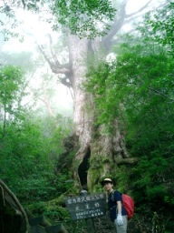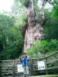 | 縄文杉の前は、 丁度私たちツアーの3人の他誰も居なくなっていました 独り占め状態です ちっちゃな男の子のようにはしゃいでカメラに収まりました |