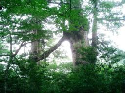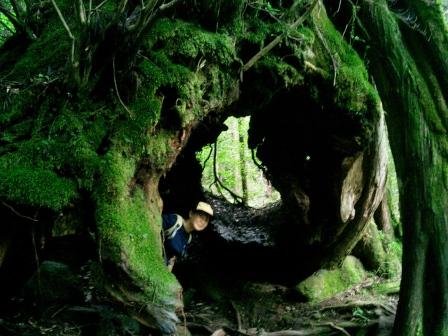 | ここはまだ体力の余裕があった頃出会った杉…「三代杉」 約1500年前に倒れた杉から2代目が育ち、 それが江戸時代伐採されて、さらにその切り株から3代目が… この空洞は1代目が朽ちてできたもの 穴からひょこっと顔を出しました 「森への入り口」ってタイトルどう?とはガイドさんの言葉 |