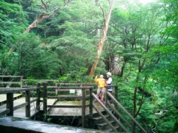 | ウイルソン株での早い昼食は、縄文杉で混み合う時間を 回避してゆっくり観賞するためと、 早くも雨模様だったためです ここからは雨具を着用して急な登りに挑戦です あまりの急坂にさすがに「もう駄目…」とへばりそうになりました 「ここはあの野際陽子さんも登ったんだよ」の言葉に なんとか奮起した私です その後はなんとか元気を取り戻し、周囲を楽しみながら 期待に胸ふくらませ縄文杉を目指しました |