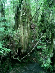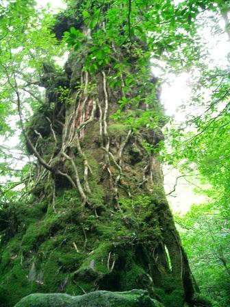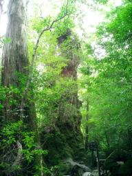 | トロッコ道が終わり、大株歩道入り口に到着 ここからは急な登りの連続…本格的な山登りになります 最初に目にした巨木…「翁杉」 推定樹齢は2000年、樹高は23.7m、幹周りは縄文杉に次いで太いのだとか… 数種の植物が着生し、苔に覆われたその木は 老木らしく威厳が感じられました |