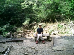 | 縄文杉に向かう前に休憩 小さな沢が流れ、その水を口に含みます この山の水は冷たくて美味しくて… この水を空のペットボトルに詰めてさあもう一踏ん張りだ! |