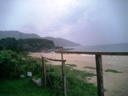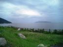 | 「千尋の滝」の駐車場から海が見えます 山と海の距離が非常に近い…不思議な島 朝なのに夕方みたいな空でした |
