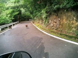 | 滝からまた県道を進むといよいよ西部林道が始まります 小型車以外通行禁止の、行き違いも一方が待避しないと できないような道です 大丈夫かな…私? 一方が山、一方が切り立った海というこの道は25kmも続きます 突然、道の真ん中にヤクシカの姿!…逃げる様子もありません |