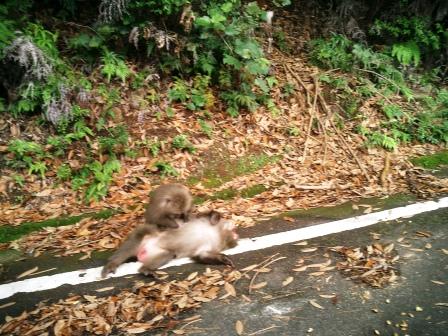 | どうして私の向かうところ誰も居ないんでしょう? 前も後ろも車は居ず私の車だけが恐る恐る進みます でも自然がそのまま残っている林道は素敵! 今度は猿の姿…ヤクザルは本土のより小ぶりで可愛らしい 人間を見ても知らん顔です…車を停めてシャッタを切りました |