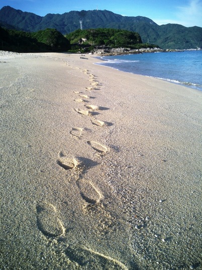 | 台風のせいかな?ここでもほとんど人に会いません 子供みたいにひとりで波と戯れたり、貝殻を探したり… こんな風に足跡で遊んだり… 花崗岩でできた白砂の海岸は いつまでも飽きることがありませんでした |