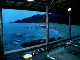 | 夕餉は母屋の外の海際のデッキで頂きます 民宿ではわいわい皆で食べたのに… ここでは部屋で別々のテーブル…当然一人 一番早く着いたので私の他誰も居ませんでした 宿の人と喋り一人夜の海を眺めてビールで乾杯! |